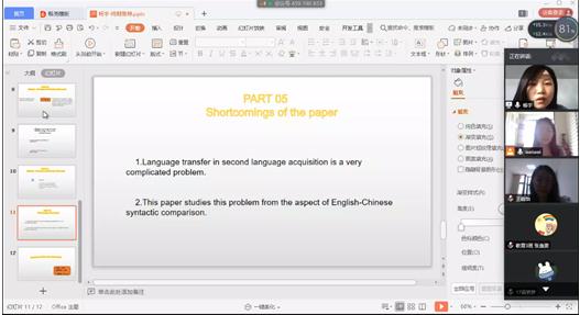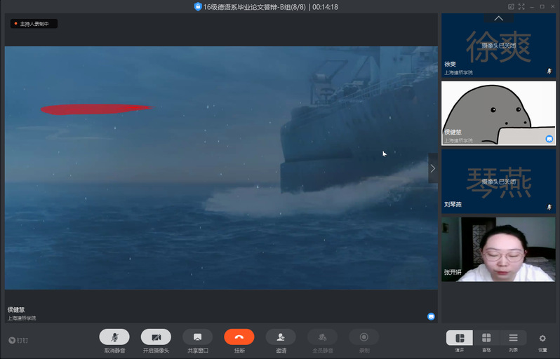 英语系采用腾讯视频会议的形式进行,答辩学生共享电脑桌面和摄像头,同时答辩老师共享摄像头。每位学生借助PPT对自己的论文进行汇报,之后评阅教师对学生进行提问,学生根据教师的提问进行解答,之后评审教师对学生论文进行点评并提出修改意见。