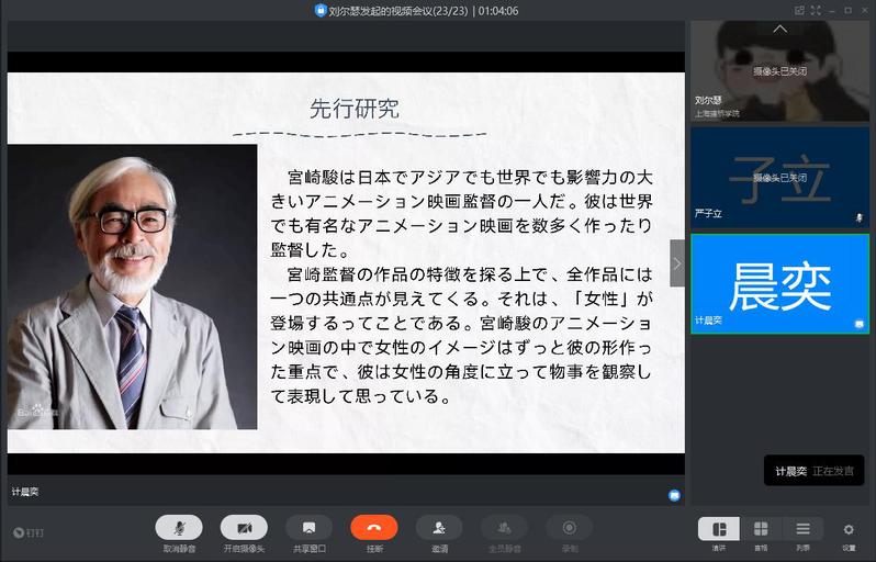 日语系利用钉钉平台进行答辩,学生扫码进入钉钉群,将答辩PPT传到钉钉群里,之后由教师邀请学生进行视频答辩。答辩学生共享屏幕并进行答辩,之后由评阅老师进行提问,学生进行作答,评审教师再根据学生的汇报以及论文撰写情况进行点评,提出需要改进的地方。