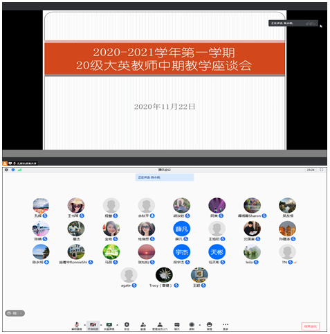 为了配合学校的中期教学检查,了解教师们前半学期的教学情况,11月22日晚19:00,外国语学院大英部通过腾讯会议召开了20级全体教师中期教学座谈会,会议由大英部副主任孔辉主持,大英部主任陈永明和近30位专兼职教师参加了本次会议。