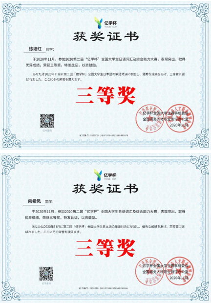 近日,由厦门亿学软件有限公司、全国商务人才职业测评办公室联合中国日语教学研究会共同举办的2020第二届“亿学杯”全国大学生日语词汇及综合能力大赛于11月28日落下帷幕。上海建桥学院外国语学院日语系精心组织,系主任刘尔瑟老师和日本外教榎園珠美老师对参赛学生进行在线指导。最终,通过与全国高校大学生在线激烈角逐,外国语学院日语系18级的练培红和向希凤两位同学获得全国决赛三等奖,另外还有66位同学在初赛中获奖。