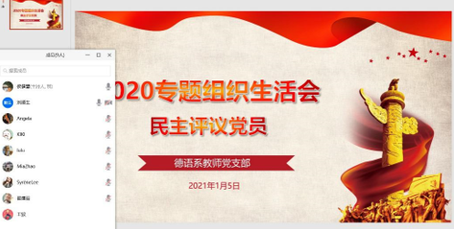 2021年1月5日晚上7点,外国语学院德语系教师党支部通过腾讯会议开展了专题组织生活会,支部全体党员线上参加了此次活动。