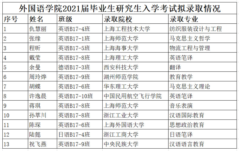 随着研究生入学考试复试结果的陆续公布,外国语学院2021届毕业生考研录取捷报频传。截止目前,外国语学院共13名毕业生分别考取了华东理工大学、上海外国语大学、上海师范大学、上海海事大学、上海理工大学、上海工程技术大学、中央民族大学等高校硕士研究生,录取人数、录取比例、录取质量均创新高。