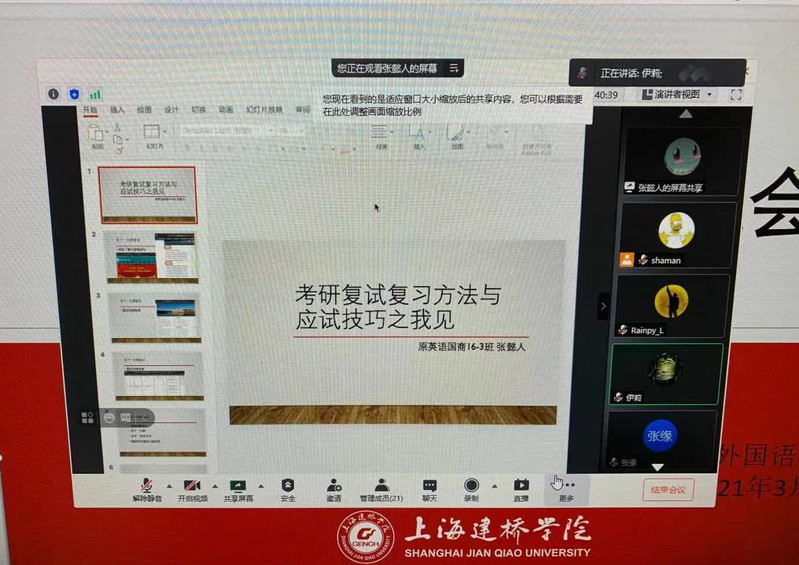 一直以来,外国语学院高度重视考研工作,大力动员和鼓励学生积极报考研究生考试,开展多种形式的动员会和交流会,为同学们搭建考研交流平台,不断推进学风建设,营造良好考研氛围。在初试结果出来后,学院领导第一时间组织线上考研复试分享会,通过学长学姐经验交流、辅导员老师经验分享和答疑解惑,扎实做好考研全程跟踪指导服务,帮助学生走好“最后一公里”,有力地保证了复试和调剂的成功率。