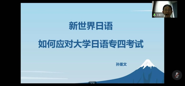 2021年5月26日下午外国语日语系运用腾讯会议软件以线上教学形式,举行了“日语专业四级NSS-4”考前辅导讲座。本次讲座主讲是日语系校企合作单位新世界教育集团的资深日语名师孙重文老师,围绕日语专业四级考试题目进行了详细的解析。本次讲座由外国语学院日语系专四负责人李熙颖老师主持。日语系教师及日语专业2019级学生近130名参加了本次讲座。