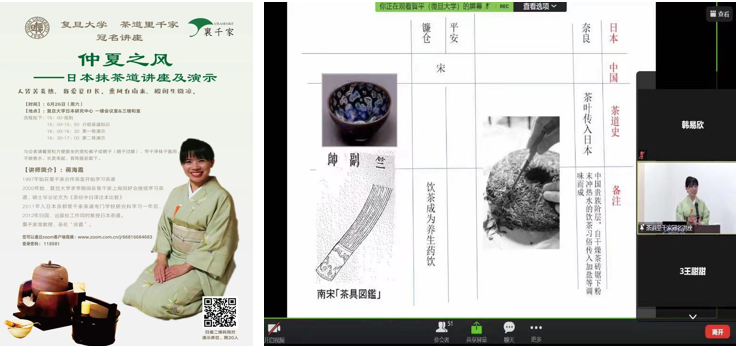 活动中,茶道专家蒋海霞(裹千里准教授,茶名“宗霞”)详细介绍了中日茶道史文化、茶道流派以及茶道的各类形式,同时剖析了日本的“三道”文化(即茶道、花道、书道)之间的汉文化背景,讲座分知识讲解和现场演示二个部分。日语系20级90余名学生通过线上不同场次参加了本次活动,学生们深深感受到日本茶道文化独特魅力的同时也领略了汉文化的内涵。活动当天也吸引了大批爱好日本文化的师生参加。