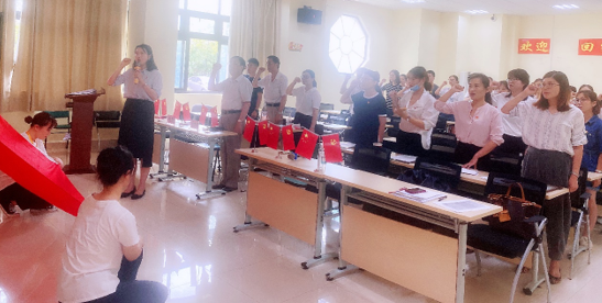 会议的最后,党委书记杜鹃担当领誓人,带领着全体党员重温了入党誓词。举起的右手是外国语学院党员肩负起的重担,口中的誓词是外国语学院党员决心的见证,不忘初心,牢记党旗下的铮铮誓言。
