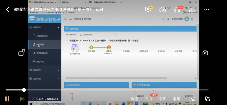 由于“毕业环节管理系统”今年首次在我校毕业论文工作中进行全面推行,为了帮助全体指导教师尽快熟悉并了解该系统的各项功能和操作方法,日语系18级毕业论文工作组的魏嘉敏老师利用共享屏幕,为全体论文指导教师进行了细致入微的指导。魏老师围绕开题阶段最重要的两个环节——课题的申报审批以及任务书的下发,一步一步带领老师们熟悉毕业论文管理系统各页面的操作,并明确指出了各环节在操作上的注意点以及各项内容的提交节点。最后,日语系将本次培训讲座的内容进行整合,制作成“日语系毕业论文管理系统教学视频”分享给全体论文指导教师,以供老师们在会后也能有重点地进行观摩学习。