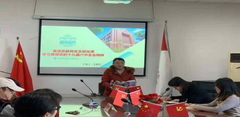 12月23日下午,英语系教师党支部在外语楼229室开展党课学习十九届六中全会精神,由支部书记王君兰老师带领支部全体党员学习党的十九届六中全会精神。党课学习中,首先王君兰老师介绍了党的十九届六中全会的基本情况,《中共中央关于党的百年奋斗重大成就和历史经验的决议》的主要内容等,然后学院党委杜鹃书记鼓励大家深刻理解、领会党的十九届六中全会精神,不忘共产党人的初心和使命,立德树人,建议党员教师在理论学习时多阅读相关的英文文献,如《习近平谈治国理政》英文版等,坚定政治方向, 强化责任担当,开展课程思政。