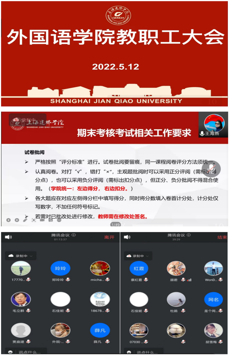5月12日晚,外国语学院通过腾讯会议召开期末教学工作会议,学院党政领导班子成员及全体专、兼职教职工参加了会议。会议由毛立群院长主持。