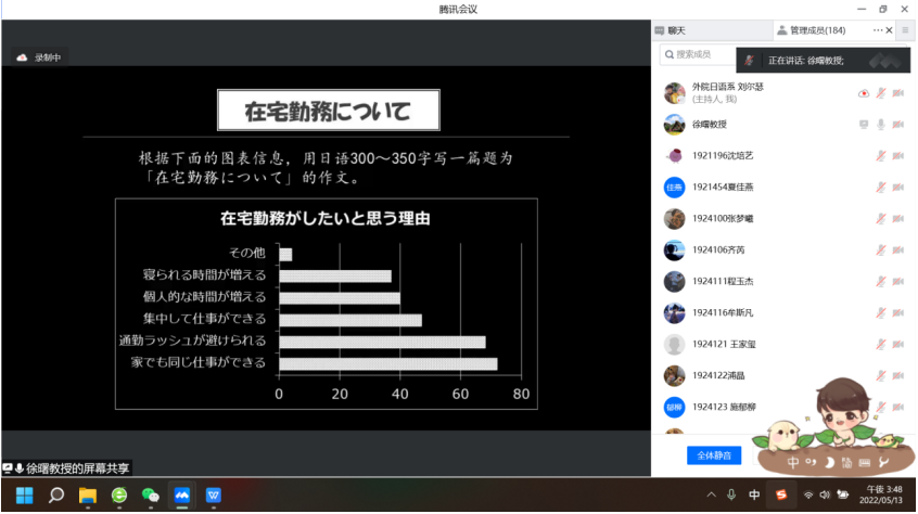 2022年5月13日下午,外国语学院日语系特邀上海对外经贸大学外语学院徐曙教授,围绕“日语专四考试的要点及难点解析”在腾讯会议上进行了1个半小时的日语专业四级考试指导讲座。本次讲座由日语系主任刘尔瑟主持,共有超过180名来自日语专业20级、19级以及部分其他专业的学生参加。