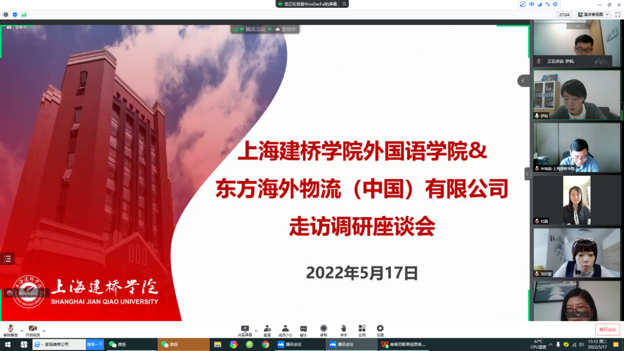 为贯彻落实党中央、国务院“稳就业”“保就业”决策部署,充分发挥校院两级领导带头做好毕业生就业工作的重要示范作用,带动学院全员深度参与毕业生就业工作,5月17日下午,外国语学院通过腾讯会议对东方海外物流(中国)有限公司进行线上走访。校长朱瑞庭,外国语学院院长毛立群、党委书记杜鹃、党委副书记伊莉,东方海外物流(中国)有限公司人力资源部及行政部张经理、刘主任,以及外国语学院各系主任、毕业班辅导员和学生代表参加线上会议,会议由伊莉主持。
