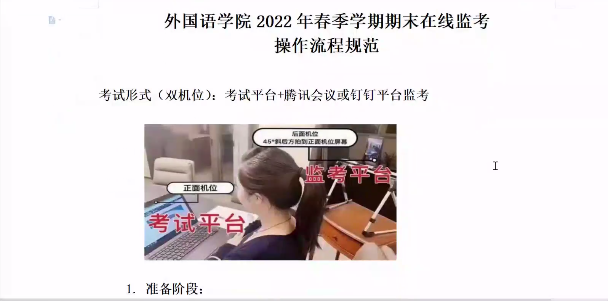 根据学校会议精神,外国语学院结合实际情况制订了《在线监考操作流程规范》和《考生须知》。会上,教学秘书石佳妮老师对监考流程进行了详细的解读,提出了明确的监考要求,并就《考生须知》与老师们进行了沟通。王海燕副院长分享了《词汇学》课程任课教师就考试注意事项与学生沟通的优秀案例。她特别强调了期末考试的重要性和严肃性,要求全体监考老师增强责任意识,严格遵守考试监考程序,监考过程做到公平公正。最后,老师们对监考过程中可能存在的问题又做了进一步探讨。