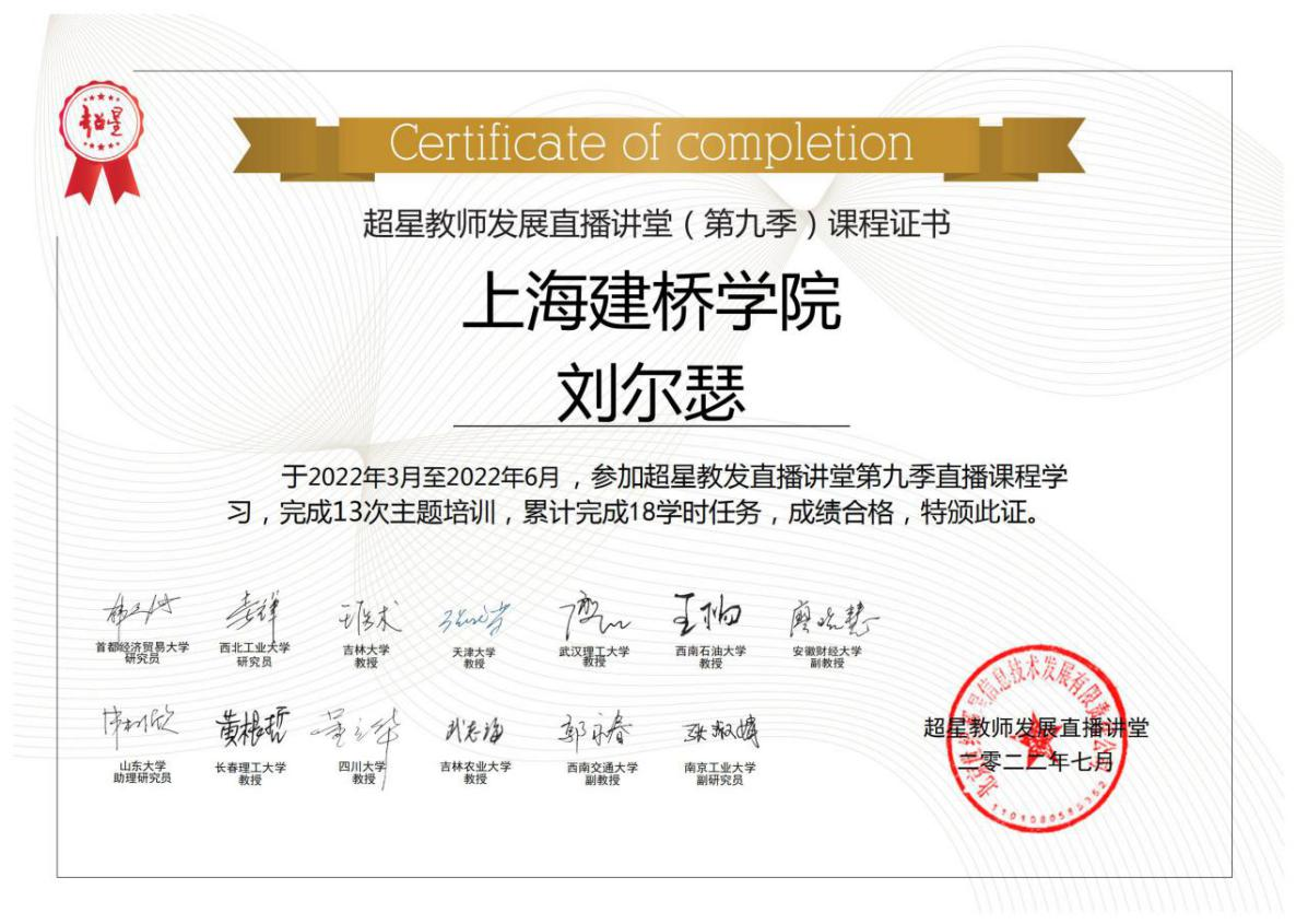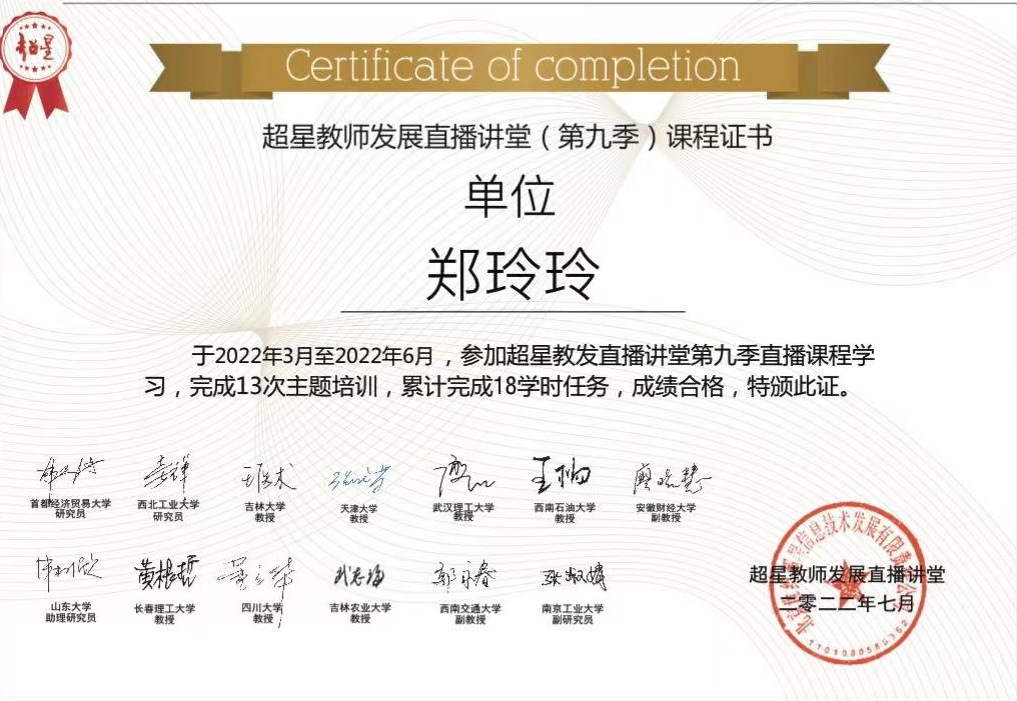 2022年3月至6月,外国语学院日语系主任刘尔瑟以及日语系教师李熙颖、郑玲玲参加2022年春季超星教师发展第九季直播讲堂,完成13次主题培训,通过考核顺利结业。本季超星教发直播讲堂以“卓越教学能力提升 助力创新人才培养”为大主题,设置了四大课程模块,13位主讲教师分别是来自首都经济贸易大学、武汉理工大学、四川大学、西南交通大学等高校的知名专家,历时三个月从新时代人才培养、卓越教学能力提升、四新背景下学科教学实践、学习测评与教学改进四个方面进行了分享。