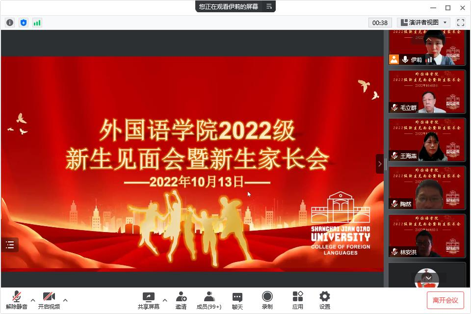 为了帮助新生更好地了解外国语学院,适应大学生活,同时加强家长与学院的互动,打造良好的家校联系网络,10月13日下午14:30,外国语学院于线上举行2022级新生见面会暨家长会。会议由党委副书记伊莉主持,外国语学院院长毛立群、党委书记杜鹃、副院长王海燕、各系部主任、辅导员、2022级新生及家长们通过腾讯会议的形式参加了本次见面会。