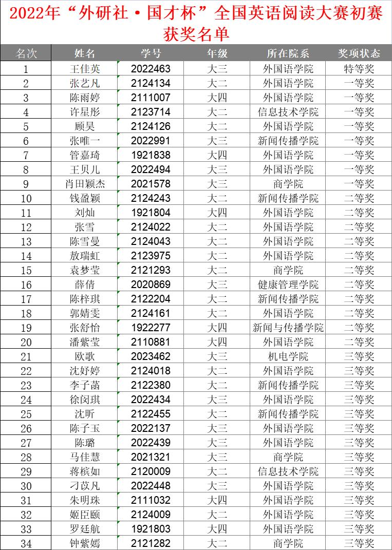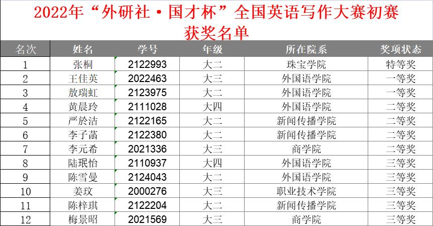 受疫情影响,本次阅读与写作大赛全部采用线上比赛的方式。受名额限制,阅读大赛初赛共有120名同学报名参加,其中1名同学荣获特等奖, 8名同学获得一等奖,11名同学获得二等奖,14名同学获得三等奖;写作大赛初赛则共有52名同学报名参加,其中1名同学荣获特等奖,2名同学获得一等奖,4名同学获得二等奖,5名同学获得三等奖的优异成绩。凭借出色的表现,珠宝学院的张桐同学、外国语学院的王佳英同学和敖瑞虹同学将代表学校参加写作大赛上海市复赛;同时外国语学院的王佳英同学和陈雨婷同学将参加阅读大赛上海赛区复赛,预祝她们再创佳绩!