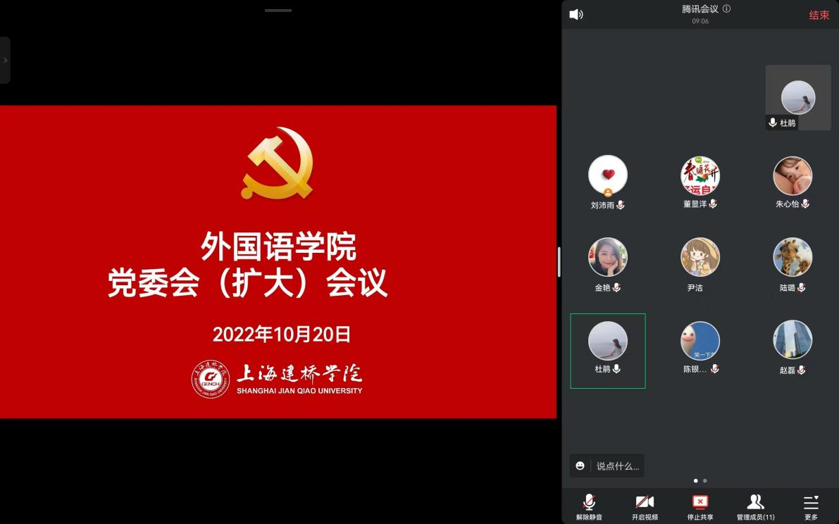 10月20日上午,外国语学院召开党委会扩大会议,及时深入学习党的二十大报告精神。学院党委书记杜鹃、副书记伊莉、党委委员以及各支部书记出席会议并作交流发言。