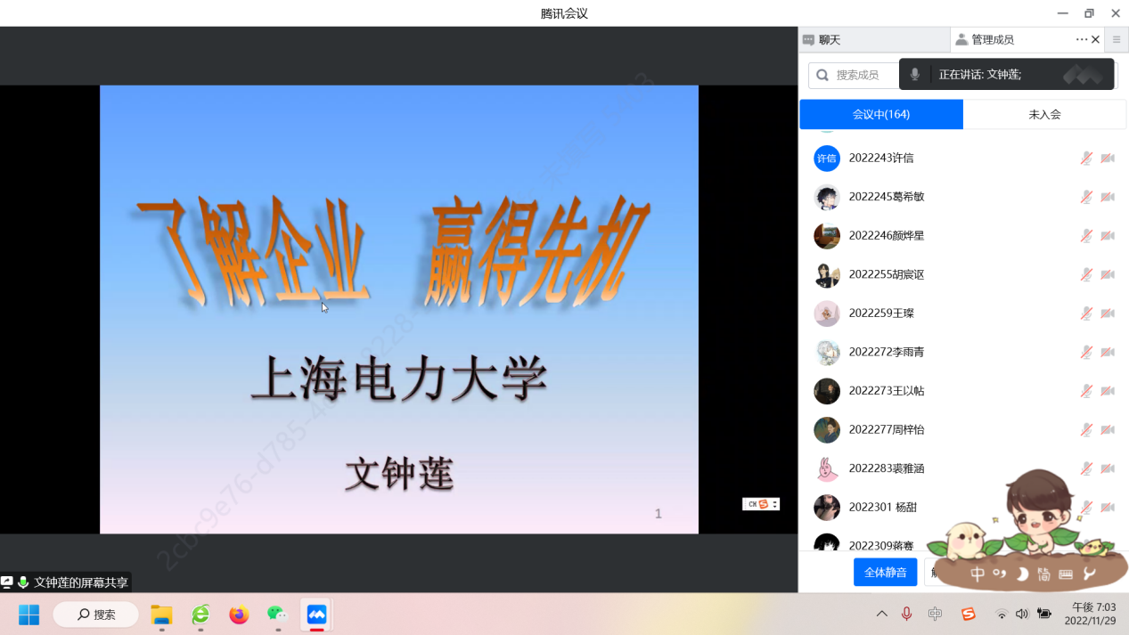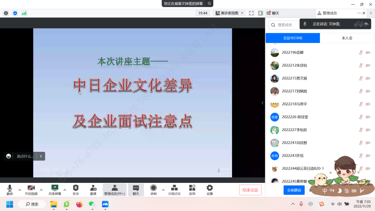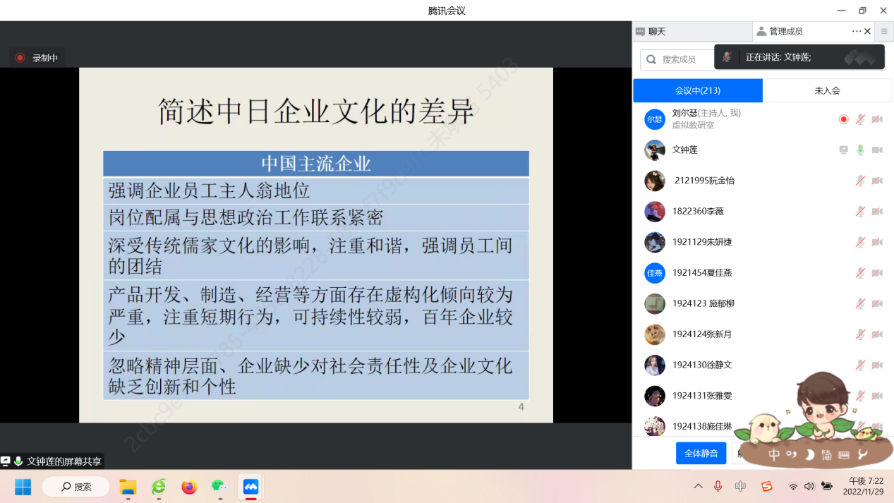 2022年11月29日(周二)晚上7:00-8:30,外国语学院日语系有幸邀请到上海电力大学外国语学院日语系主任、区域国别科研团队负责人文钟莲教授,为我校外国语学院日语系20级、21级约220名同学进行了题为“探析中日企业文化异同点”的学术讲座。本次讲座由外国语学院与科研处共同举办,由日语系主任刘尔瑟老师主持。