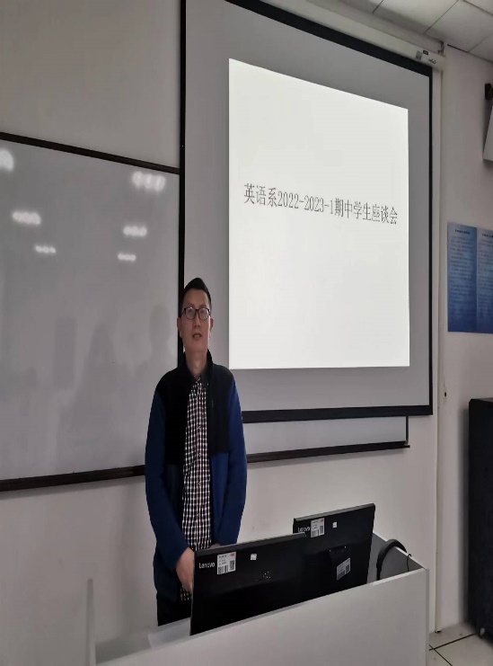 根据学校的安排,英语系召开了期中学生座谈会,英语系副主任陶然、英语系学生代表参加了会议,会议由英语系副主任林安洪主持。