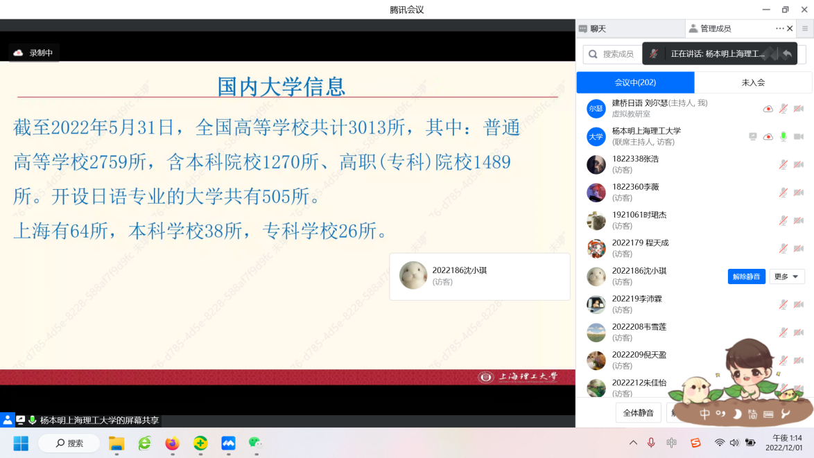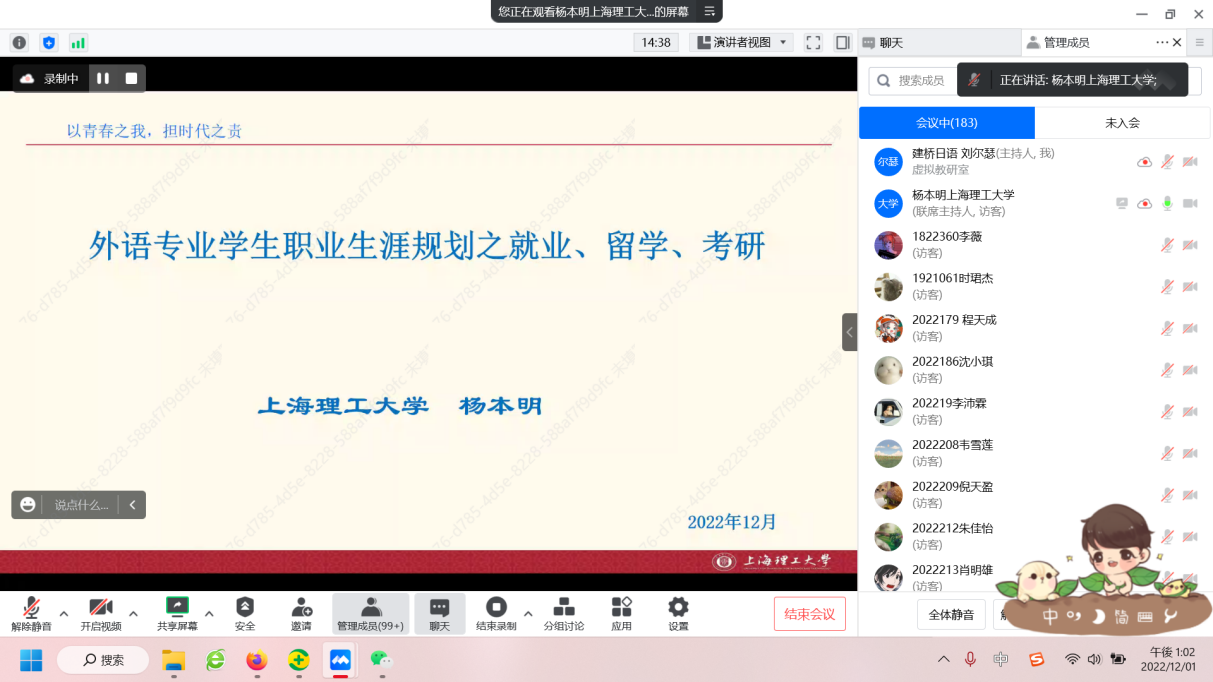 2022年12月1日(周四)下午13:00-14:30,外国语学院日语系有幸邀请到上海理工大学外语学院MTI教育中心副主任、上海理工大学青年五四奖章获得者、第三届第四届“儒易杯”中华文化国际翻译大赛评审专家、教育部学位中心论文评审专家杨本明副教授,为我校外国语学院日语系19级、20级、21级约210名同学进行了题为“外语专业学生职业生涯规划之就业、留学、考研”的学术讲座。本次讲座由外国语学院与科研处共同举办,由日语系主任刘尔瑟老师主持。日语系张雪娜副教授、刘雪飞副教授及其他青年教师一同参加了本次讲座。