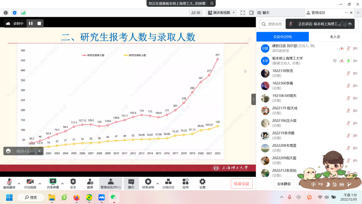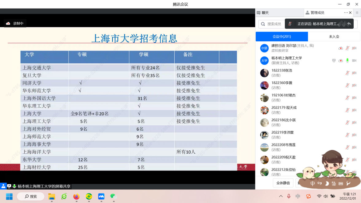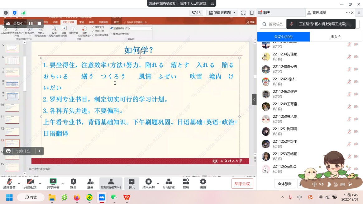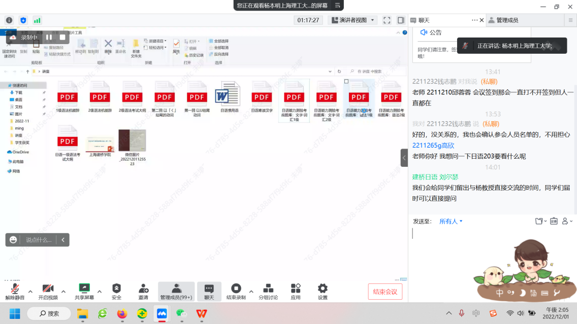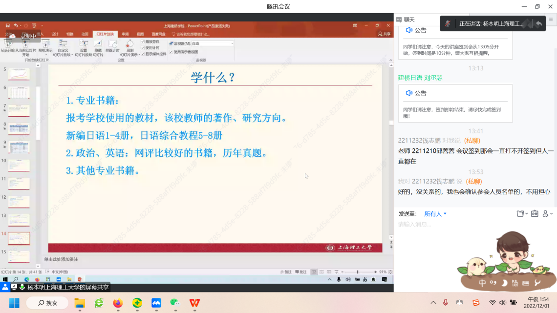 杨本明副教授首先介绍了我国近二十年的出生人口与高考录取人数、近年全国的研究生报考人数与录取人数以及上海地区的研究生报考人数和录取比率,并且系统地介绍了日语专业的学术硕士和专业硕士的备考方法、复习要点以及注意事项。杨教授还利用微信群,慷慨地与同学们分享他了多年积累的各类日语专业考研复习资料,同学们反响热烈。