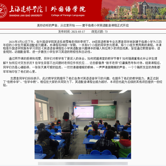 此外,胡雪梅老师申报立项了服务学习项目,带领英语教育专业同学去建平临港小学上英语配音课,调动了小学生对英语的学习兴趣和热情,他们学会了音标和发音规则、积极参与朗读与配音,达到了较好的教学效果,受到服务单位--建平临港小学的好评。项目为志愿者同学们提供了教学实践平台,让他们参与课程开发和实施的全过程,提升了他们的教学能力,真正达到了“在教中学”、“在学中教”,有利于他们明确就业方向,提升就业竞争力,同时也体现了高校学子“全心全意为人民服务”的使命担当。