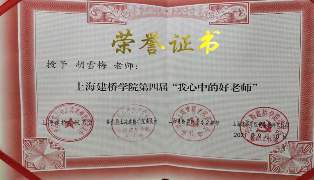 “认真踏实做事,低调朴实为人,在平凡的工作中取得不平凡的成绩”是胡雪梅老师教书育人工作的真实写照。胡雪梅老师2010年从上海对外经贸大学毕业进入我院工作,至今已经有11年时间。作为一名一线教师,她始终坚守教学第一线,在平凡的岗位中默默奉献自己的力量。在过去的11年间,她首批入选上海建桥学院骨干人才计划,曾获得上海建桥学院青年教师教学竞赛二等奖,外国语学院“卓越建桥人”,同时,胡雪梅老师亦是有着12年党龄的老党员,俗话说,一个党员就是“一面旗帜"。党员教师就是教师当中的旗帜,她能够时时刻刻以党员的标准严格要求自己,自觉遵守教师职业道德,教书育人,为人师表,因此,获得外国语学院“两学一做”优秀共产党员等荣誉。今年,胡雪梅老师又荣膺“我心中的好老师”称号。