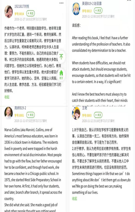 课外,她还在趣练习小程序中设立阅读打卡课程,和学生一起共读原版书籍,不少学生通过完成每学期的阅读,克服了阅读障碍,慢慢养成了阅读英语的习惯,提高了阅读水平。19级凌可盈同学创下一学期阅读19本原版书的记录,16级镐凯莉同学坚持原版阅读两个月后,lexile分数上升了400分。教育专业的同学通过对教学类书籍的阅读,不仅提高了阅读水平,还学到了丰富的教育教学知识,为他们考取各类教师资格证书打下更坚实的基础,其中19级孙悦同学一次性通过了剑桥英语教学能力认证考试(TKT)三个模块。
