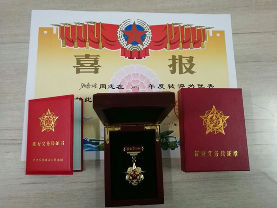 作为一名由高校入伍的义务兵,他充分利用自己的优势,训练上刻苦努力、奋力拼搏,因军事素质优异,多次代表所在单位接受上级武警总队军事考核;文娱活动中,他积极参与,表现突出,演讲比赛、征文比赛、各项文艺晚会上总能见到他的身影;在机动部队服役期间,他先后参加2017年香港特别行政区领导人换届选举备勤,参加2017年福建厦门金砖国家领导人会议安保获安保忠诚卫士称号,参加武警部队2018实战军事演习等,均圆满完成任务。获得武警部队嘉奖一次,获得“优秀义务兵”称号一次。