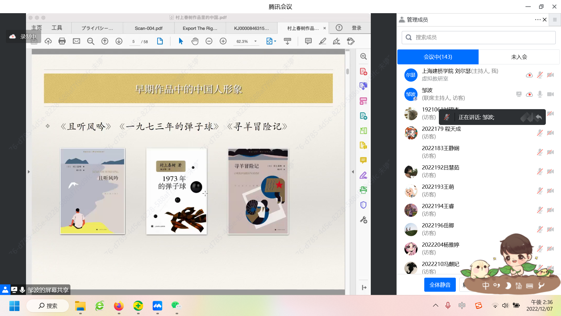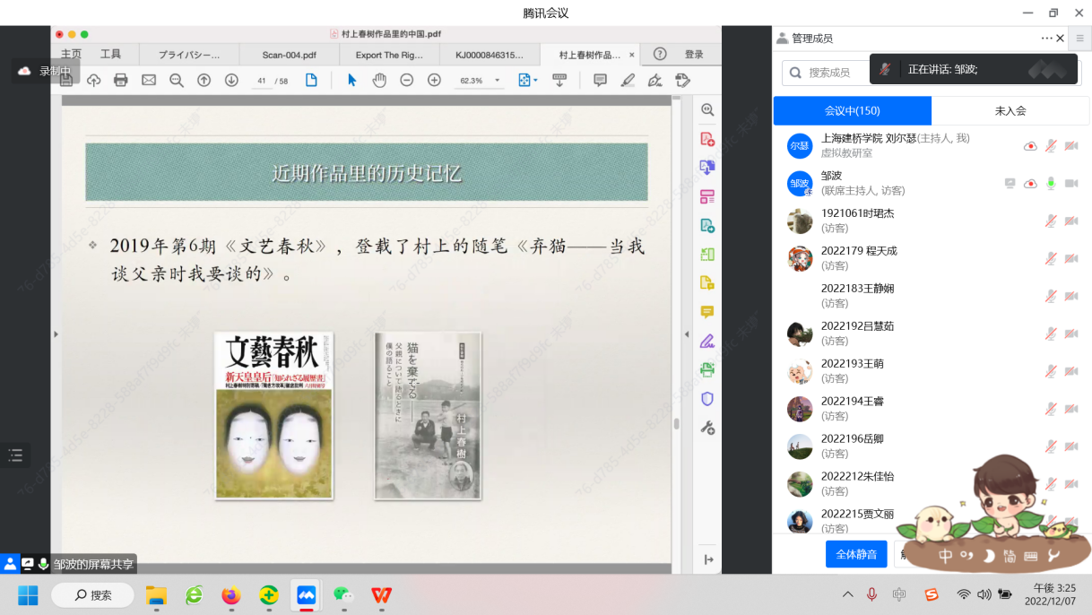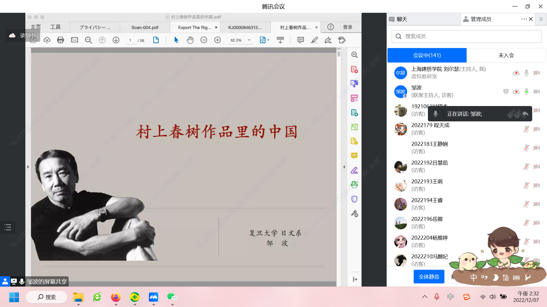 2022年12月7日(周三)下午14:30-16:00,外国语学院日语系有幸邀请到复旦大学外文学院日文系主任、中国日语教学研究会上海分会副会长、中国日语教学研究会常务理事邹波副教授,为我校外国语学院日语系20级、21级、22级约150名同学进行了题为“村上春树作品里的中国”的学术讲座。本次讲座由外国语学院与科研处共同举办,由日语系主任刘尔瑟老师主持。