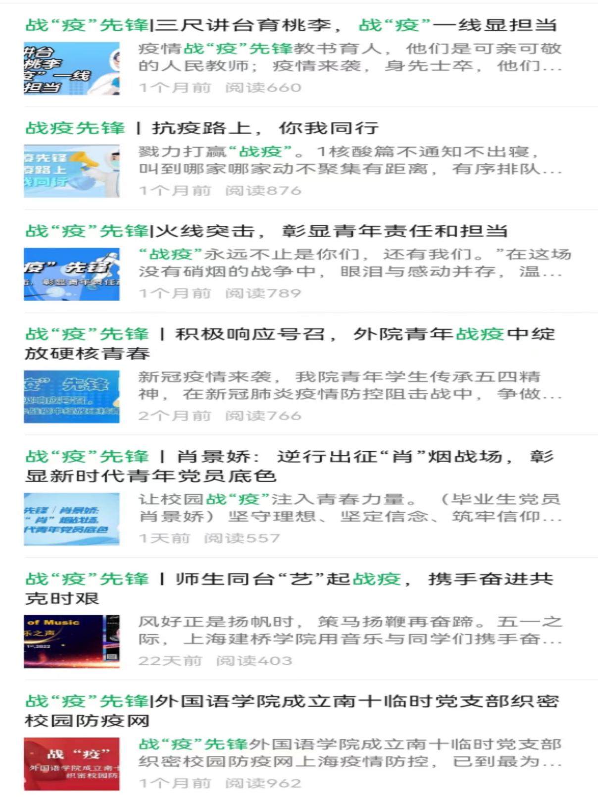 当前,校园疫情防控中,可歌可泣的抗疫感人故事不断涌现,这无疑是一堂鲜活生动的爱国主义教育思政课。学院党委书记杜鹃要求学院结合当前的疫情最新进展情况和相关文件精神撰写文章,利用网络讲堂引导学生开展学习,先后撰写了《肖景娇:逆行出征“肖”烟战场,彰显新时代青年党员底色》、《统一思想,坚定信心,落实行动,坚决打赢大上海保卫战》、《师生同台“艺”起战疫,携手奋进共克时艰》、《抗疫路上,你我同行》、《三尺讲台育桃李,战“疫”一线显担当》、《火线突击,彰显青年责任和担当》、《成立南十临时党支部织密校园防疫网》、《退役不退志 退伍不褪色 离军不离党》、《积极响应号召,外院青年战疫中绽放硬核青春》、《大学英语教师党支部:强化在线教学, 筑牢“红色堡垒”》 等10余篇文章。这些文章第一时间在学院党委的公众号“战疫先锋”、“战疫云课堂”等专栏上进行了推广,并组织学生进行了在线学习。学院根据当前防疫的实际情况,利用网络宣讲、微信订阅号等现代教学模式保障了党史学习教育的可持续性,保证思政教育无时不在,润物无声。