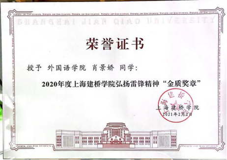 2020年疫情爆发的时候,肖景娇在海南老家也参与了多个疫情防控工作,因此,她获得了校雷锋金质奖章,但是这项荣誉对她来说不是终点,而是新的起点。“面向未来,走好新时代的长征路,我们更需要坚定理想信念、矢志拼搏奋斗。”