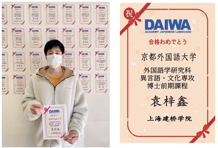 近日传来喜报,外国语学院日语系B17-2班马上青和日语系B18-2班袁梓鑫两位同学,成功获得多所日本名校研究生院的录取通知。马上青同学经过一年多的备考,顺利考上同志社大学(Doshisha University)国际研究学院国际研究专业及立命馆大学(Ritsumeikan University)政策科学研究科政策科学专业;袁梓鑫同学则成功考入日本京都外国语大学(Kyoto University of Foreign Studies)外国语学研究院异言语文化专业。