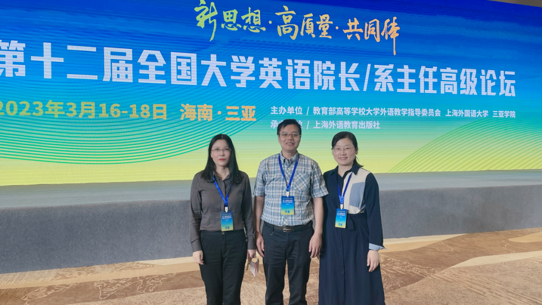 2023316-19日,由教育部高等学校大学外语教学指导委员会、上海外国语大学、三亚学院联合举办的第十二届全国大学英语院长/系主任高级论坛在海南三亚顺利召开。外国语学院副院长王海燕、院长助理孔辉、大英部主任陈永明受邀参加了论坛。
