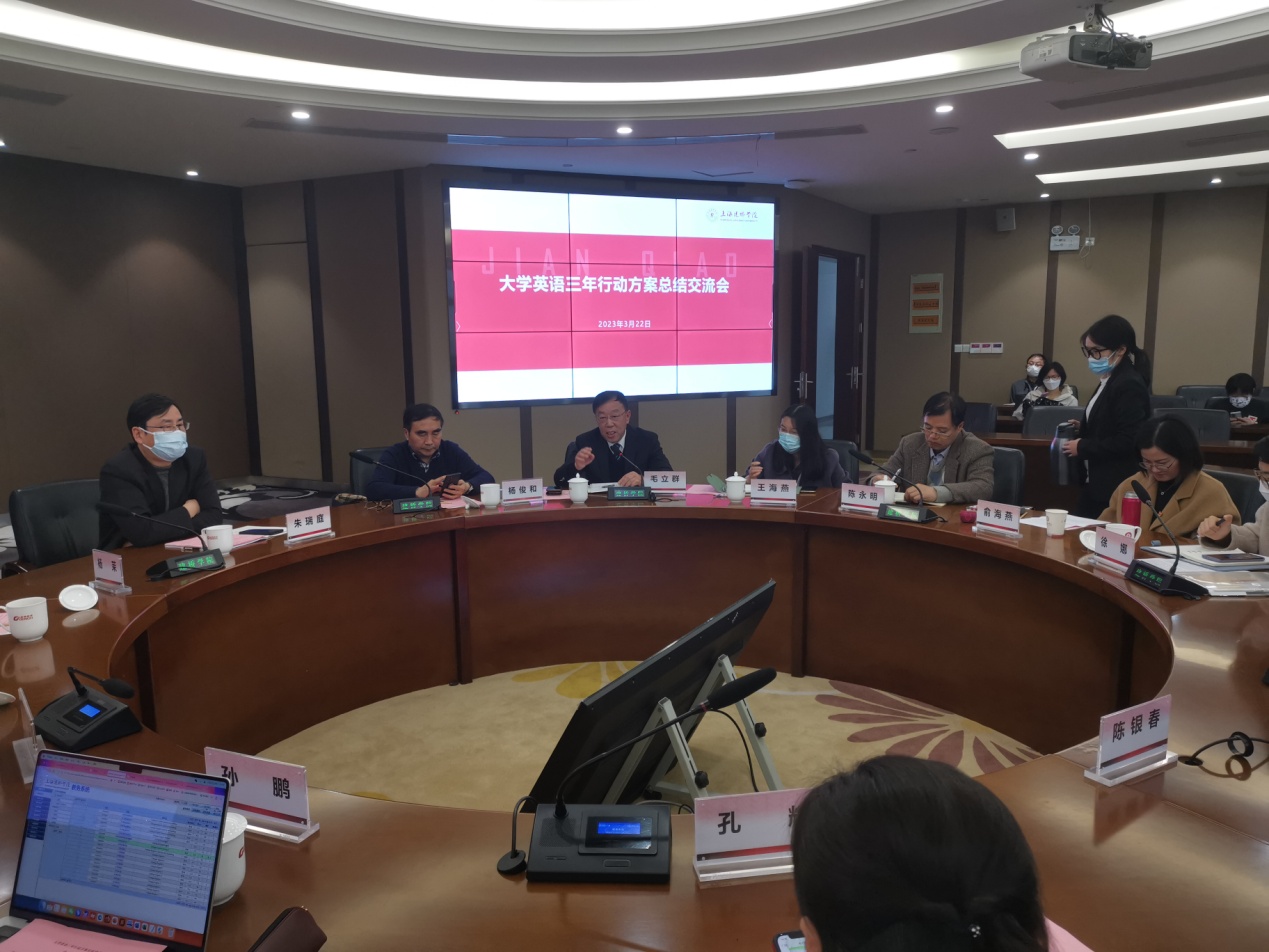 322日下午13:30-16:00,我校召开了大学英语三年行动方案总结交流会。校长朱瑞庭,副校长杨俊和、外国语学院院长毛立群、教务处杨茉处长、孙鹏副处长、朱霞副处长、各学院教学副院长、各学院副书记、外国语学院班子成员以及大学英语教学部全体教师参加了会议。本次会议由杨俊和副校长主持。