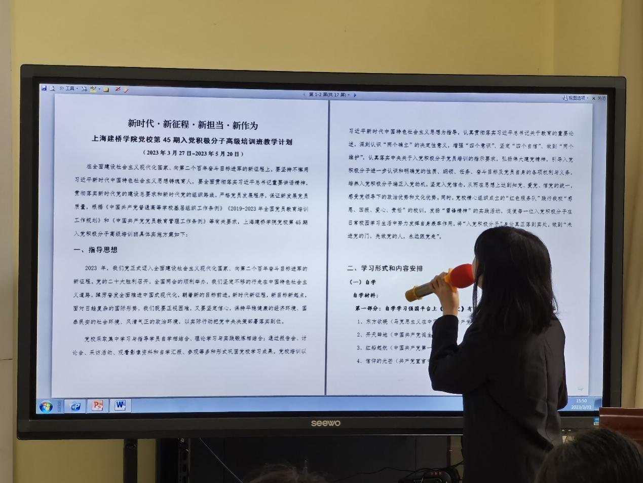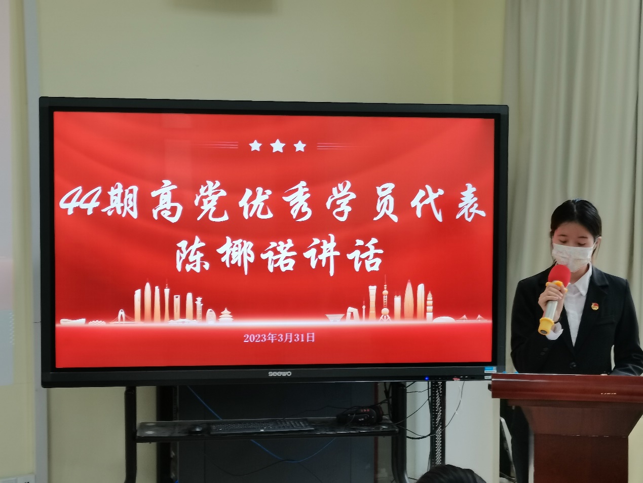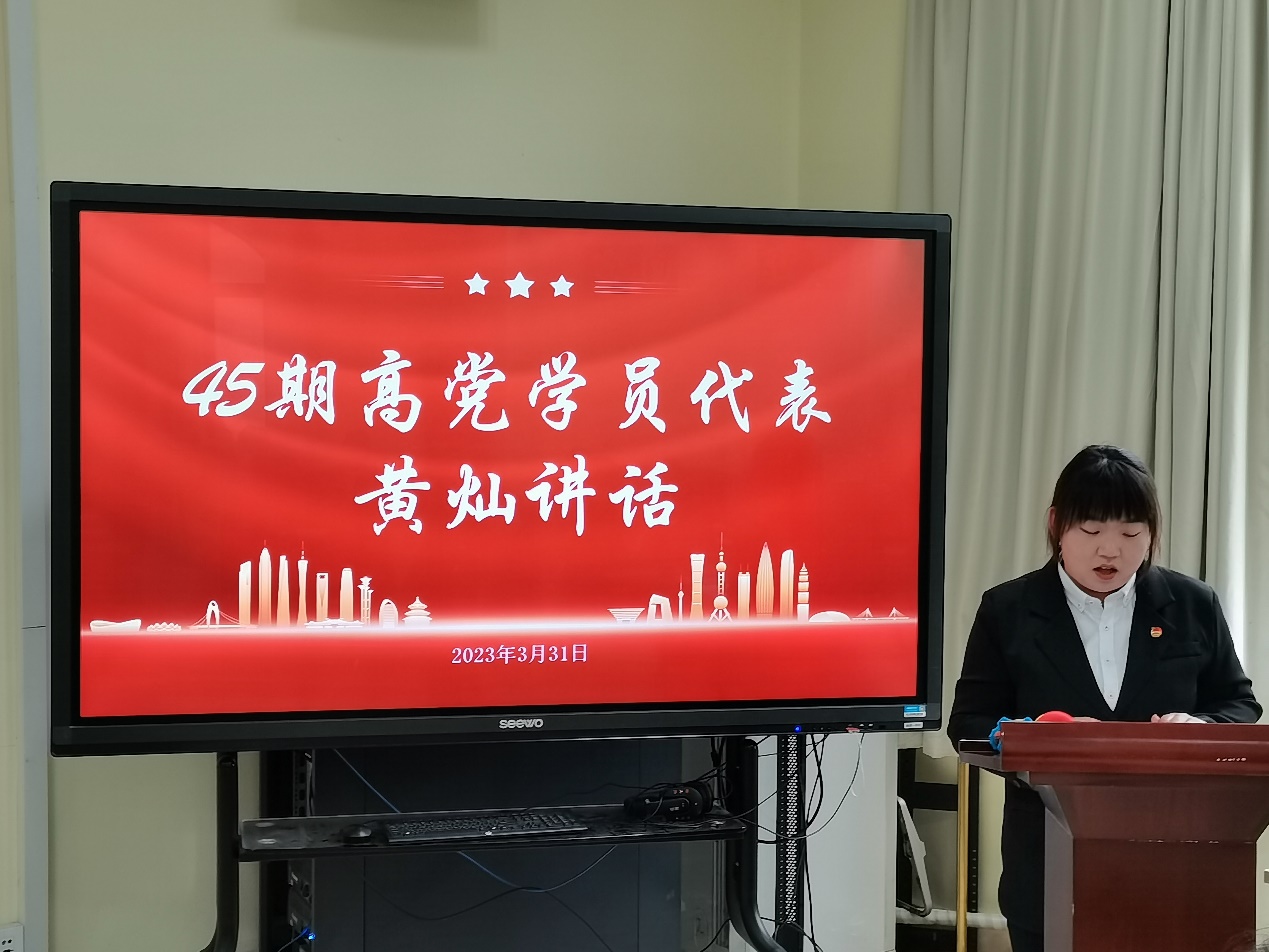 最后,黄灿同学代表第45期全体高党学员表达了积极向党组织靠拢的决心,并表示学员们会通过党课的学习,端正入党动机,从而在思想上达到知党、爱党、信党的统一。她呼吁同学们以高标准来严格要求自己,提高学习效率,积极参与课堂,认真听认真学,学出感悟、学出质量。