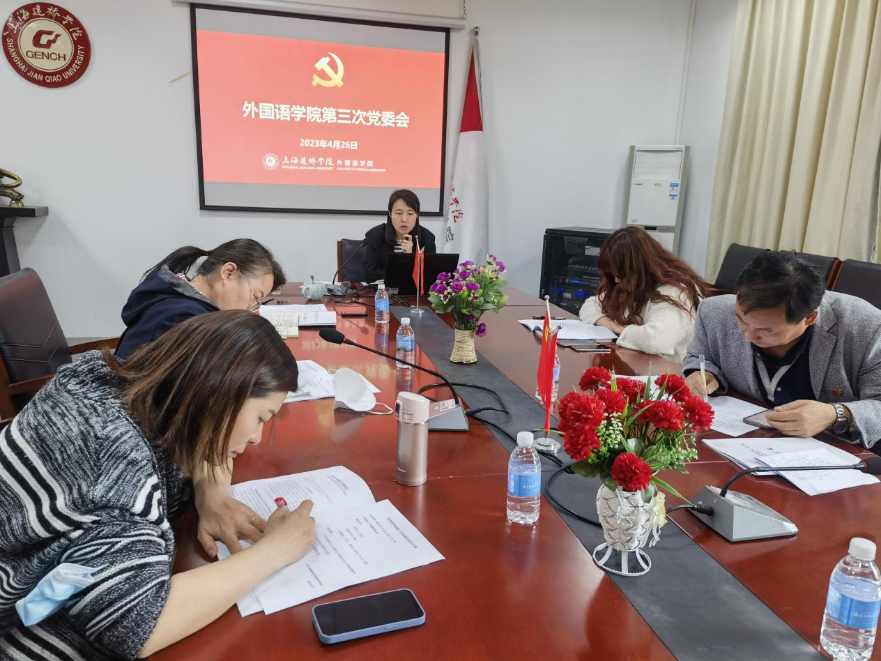 426日下午,外国语学院在229会议室召开了2023年第三次党委会,对学院进行学习贯彻习近平新时代中国特色社会主义思想主题教育动员,全体党委委员出席了本次会议,会议由外国语学院党委书记杜鹃主持。