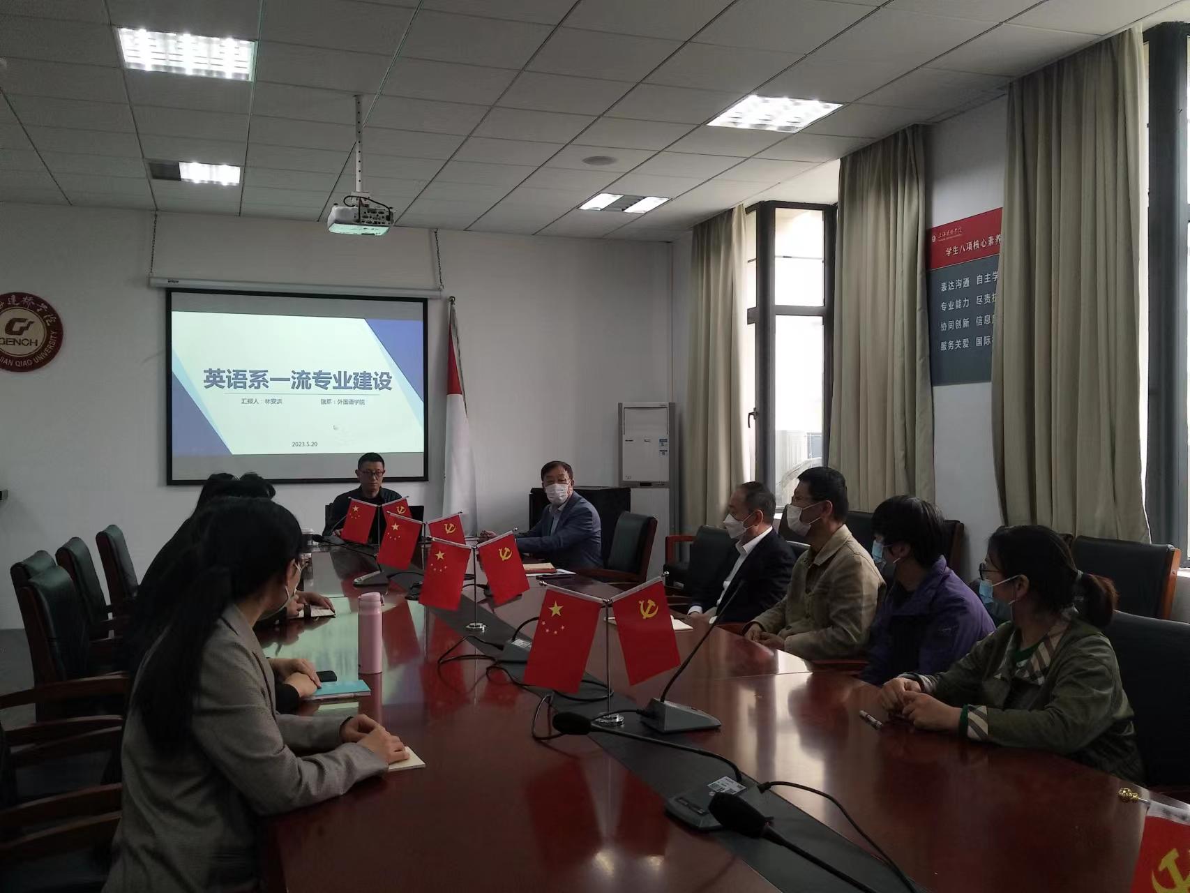 会议伊始,系主任林安洪老师从一流专业的建设基础、申报一流专业以来取得的成效、专业建设的未来规划以及商务英语专业的申报来进行了系统的汇报。
