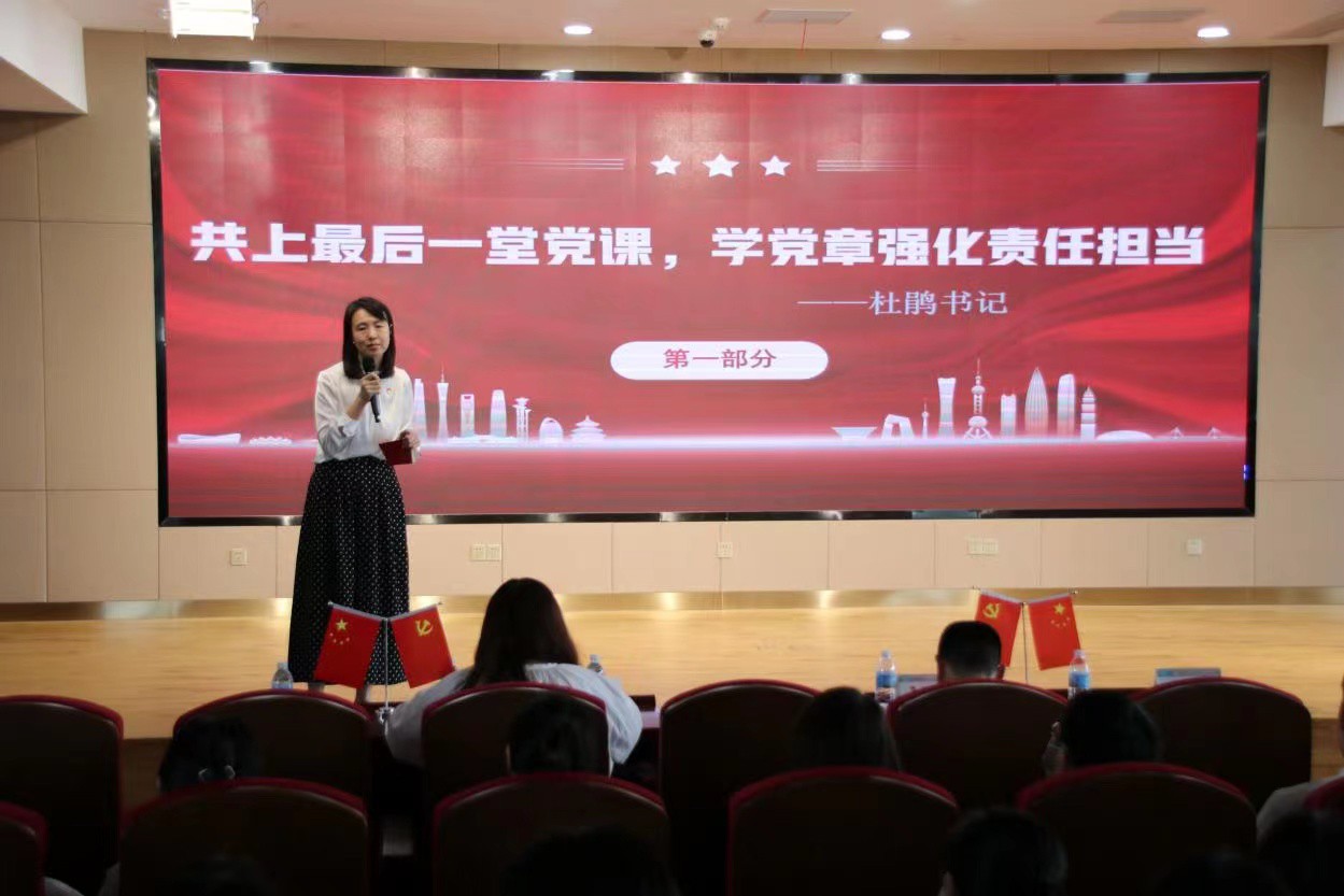 党委书记杜鹃为全体毕业生党员讲授了大学期间最后一堂党课。杜书记用“身边人身边事”结合党章中的八项权利和八项义务为毕业生党员们做了全面的讲解。首先,她讲述了学院优秀共产党员在疫情期间的先进事迹,并对全体毕业生党员提出了殷切的期望:希望全体毕业生党员牢记党员身份,关键时刻能站得出来,危难时刻能豁得出去,切实发挥共产党员先锋模范作用。其次,杜书记深刻剖析了往届毕业生在工作中遇到的难处,为大家在今后工作岗位上踏实工作、敬业奉献筑牢了坚实的思想基础。最后,勉励党员们能够像优秀校友学习,在自己的人生轨道中走稳走实,并永远怀抱母校、心系母校。同时,她寄语毕业生党员:要牢记习近平总书记的的殷殷嘱托和谆谆教诲,在走向社会、踏上新的星辰大海之际,永葆初心,回答好坚定信念、对党忠诚的政治答卷;永葆恒心,回答好追求卓越、开拓前进的奋斗答卷;永葆真心,回答好知行合一、为民服务的实干答卷,用自己的言行为党旗增光、牢记校训为母校添彩!