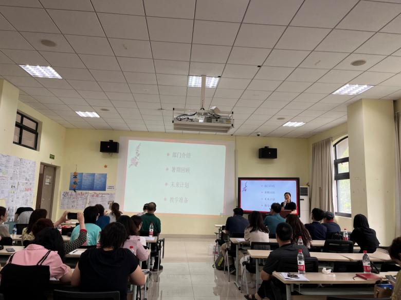 会议从部门组织架构、暑期工作回顾、新三年行动方案和新学期教学准备四个模块展开。会议伊始,孔主任代表大英部对前主任陈永明老师的付出表达感谢,并向与会老师介绍了大英部新的组织架构;随后,孔主任回顾了全体教师暑期的辛勤劳动,包括晨读手册编写、四级题库建设等;接下来,她还再次强调了新三年改革方案的内容以及奋斗目标,并表示在未来的工作中,我们将继往开来,群策群力,发挥多方合力,多管齐下,共同推进新学期大学英语教学工作。
