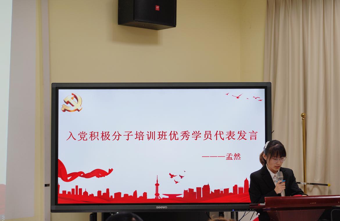 首先,第22期入党积极分子培训班优秀学员代表孟然分享了自己的工作经历,从参与各类志愿活动到创办日语学习互助小组,孟然同学用自己的实际行动表明了入党积极分子如何发挥先锋模范作用,如何展现青年的责任担当。孟然同学也希望每位入党积极分子能够加强党性修养,提高知识素养,以一名党员的标准严格要求自己。她提出:在党课学习期间,全体学员要以饱满的热情,全面投入学习,积极对待课程内容;在课堂外严格要求自己、主动完善自己;做到学深悟透,知行合一,为党和人民贡献自己,一起为中华崛起,民族复兴,为伟大的中国梦奉献自己的青春与热血。