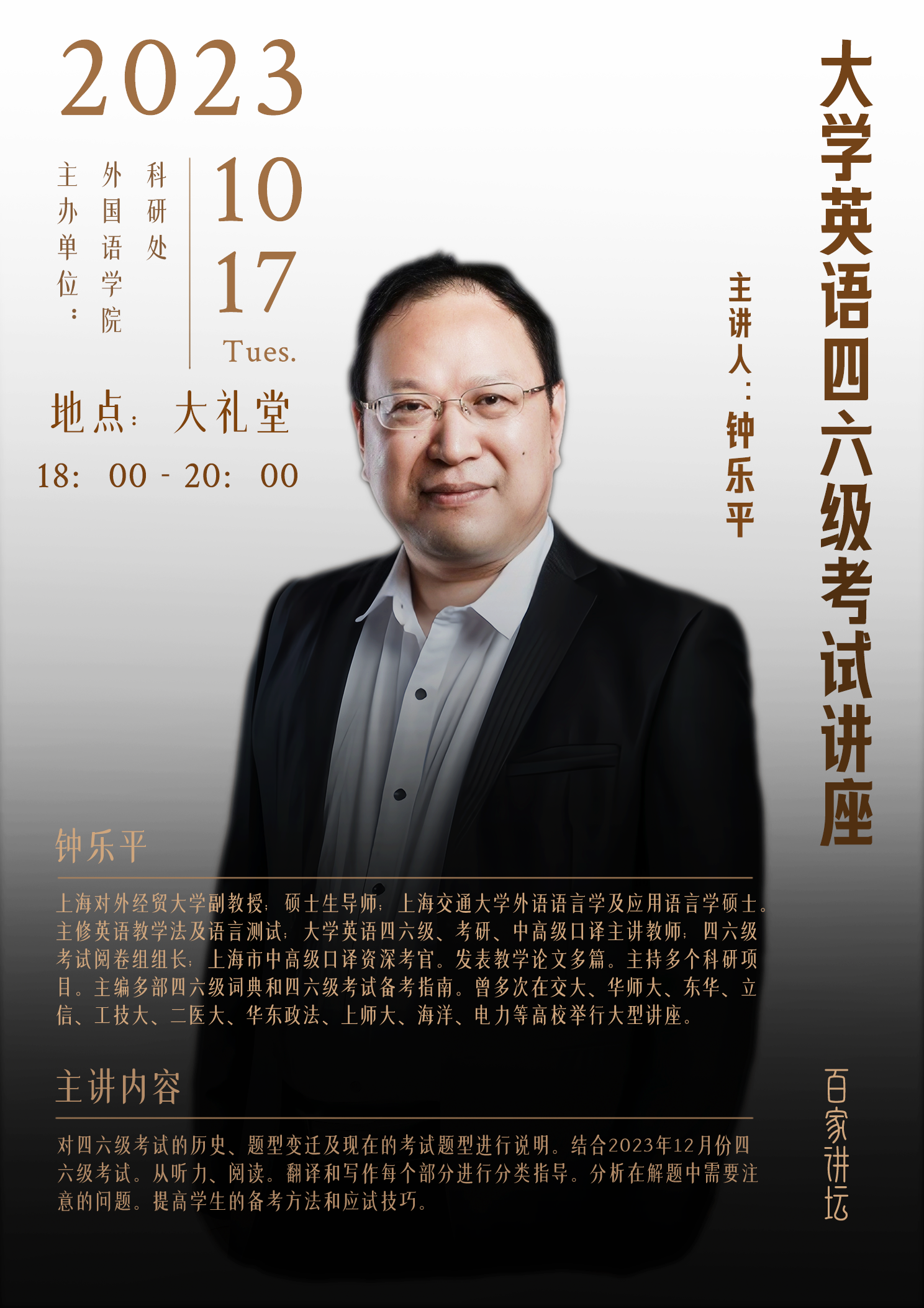 为切实加强我校学风建设,营造浓厚的学习氛围,帮助学生提升大学英语四、六级考试答题技巧,更有针对性地迎接即将到来的1216日的大学英语四、六级考试,进而提升我校四级通过率,1017日晚18点,科研处与外国语学院在大礼堂联合举办了“大学英语四六级考试讲座”,吸引了全校各个学院学生前来听讲。此次讲座由大英部主任孔辉老师主持,上海对外经贸大学钟乐平副教授主讲。大英部的傅荣琳、谭湘蓉、刘忠杰、王颖、黄莉岚、郑琳等老师也参与了本次讲座。