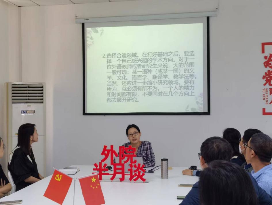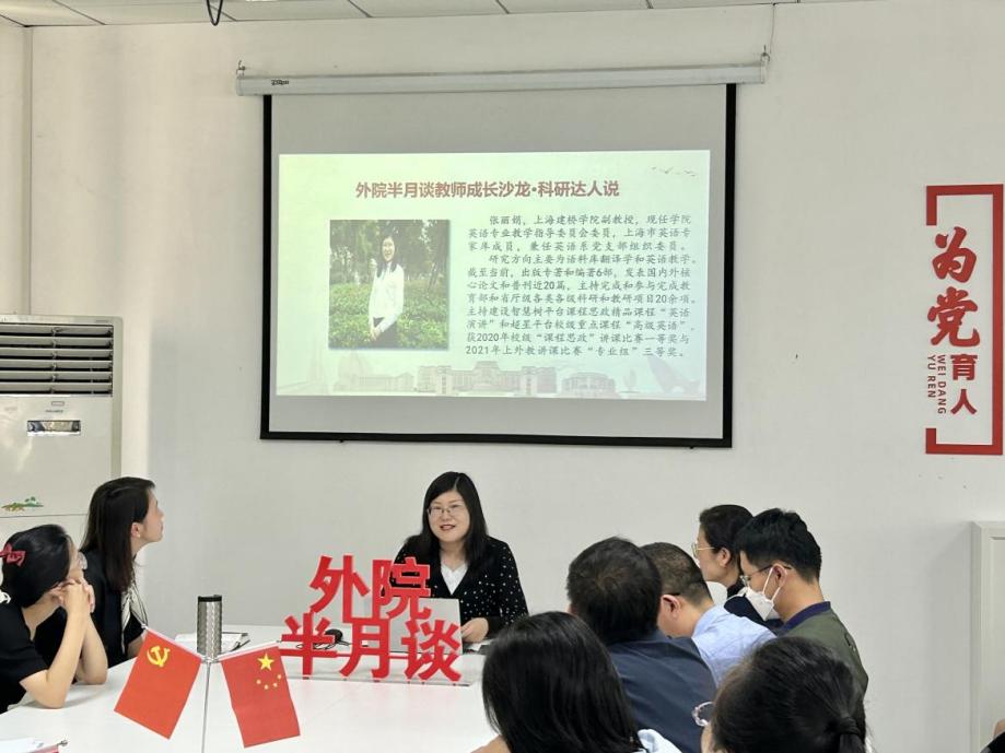 为加强教师队伍建设,外国语学院以师德师风建设月为契机,于11月2日中午12:00在303党员活动室召开“外院半月谈教师成长沙龙·科研达人说”座谈会,上海外国语大学教授毛立伟老师、学院大学英语部教授陈银春老师、学院英语系副教授张丽娟老师担纲主讲人,同时学院20位教师报名参加本次活动,活动由党委书记杜鹃主持。