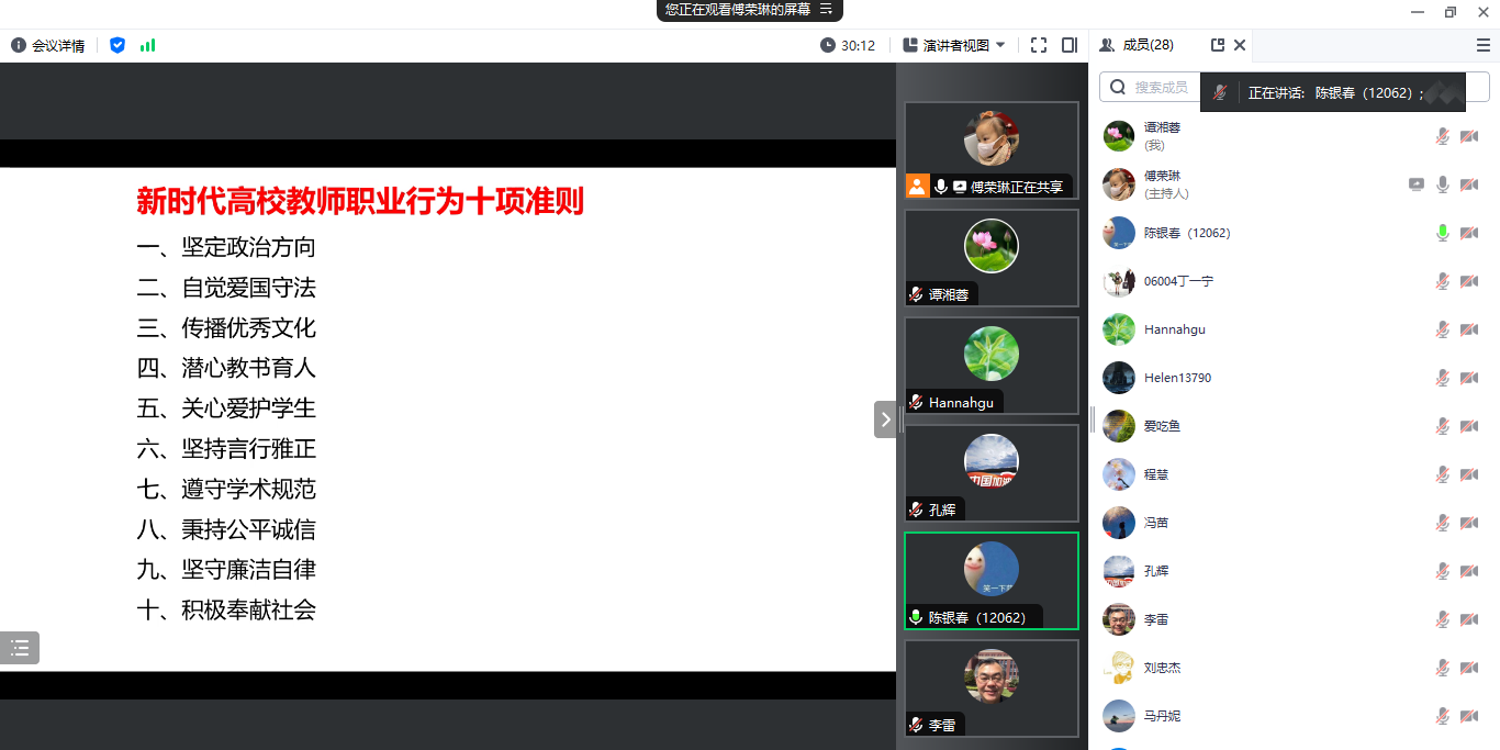 会上,大英部党支部书记陈银春老师带领大家学习,要求大家坚定政治方向,按照《教师法》的要求对待教学和科研工作;陈老师重申了新时代高校教师职业行为十项准则,要求老师们谨言慎行,为学生树立正确的榜样。