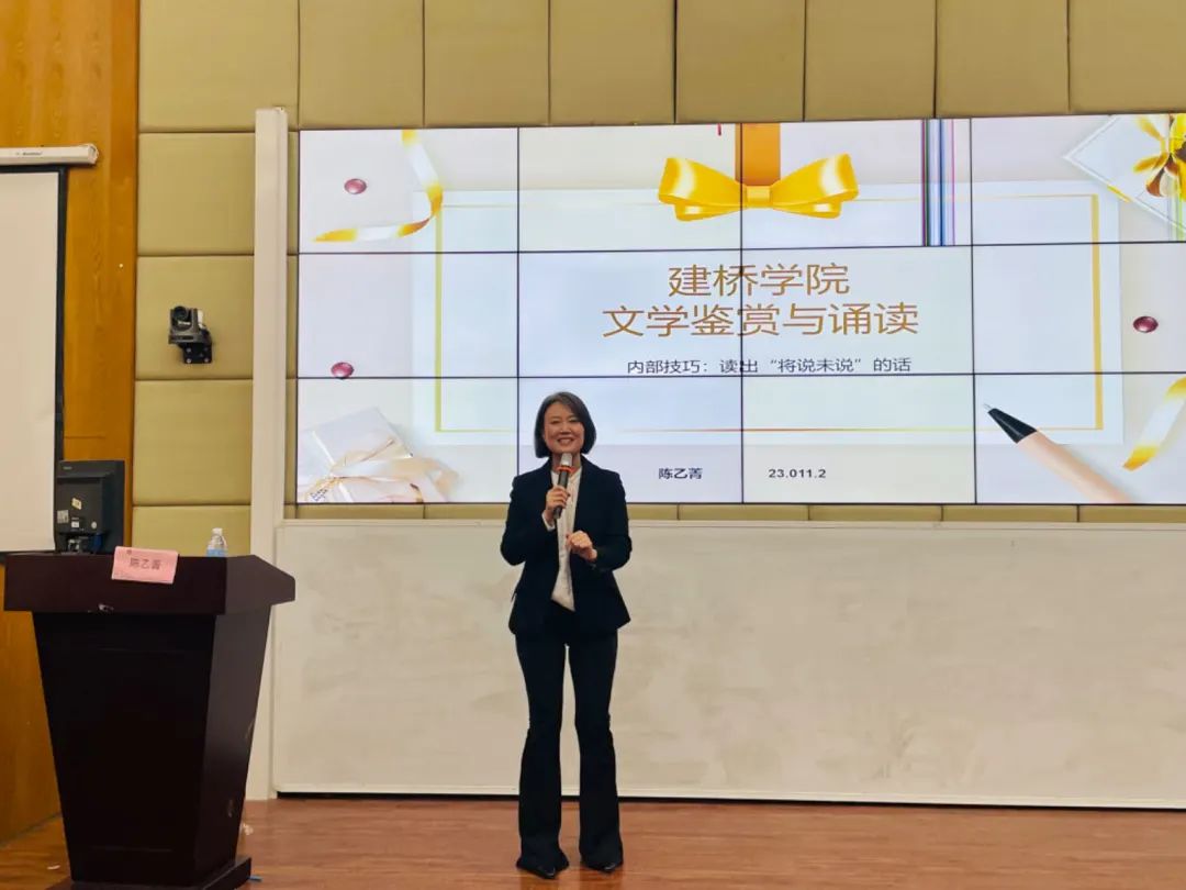 陈乙菁老师讲授了朗诵的技巧,生动有趣的讲演氛围深深地触动了在场的每位学生。陈老师运用诸多实例,指导学生们深入理解并掌握“情景再现”这一阅读技巧,使学生们在文学的朗诵中精确理解和运用朗诵的内外技巧:读出“将说未说”的话语并能够实现“语流”,真正流畅流转,从而做到“善思”和“勇讲”。
