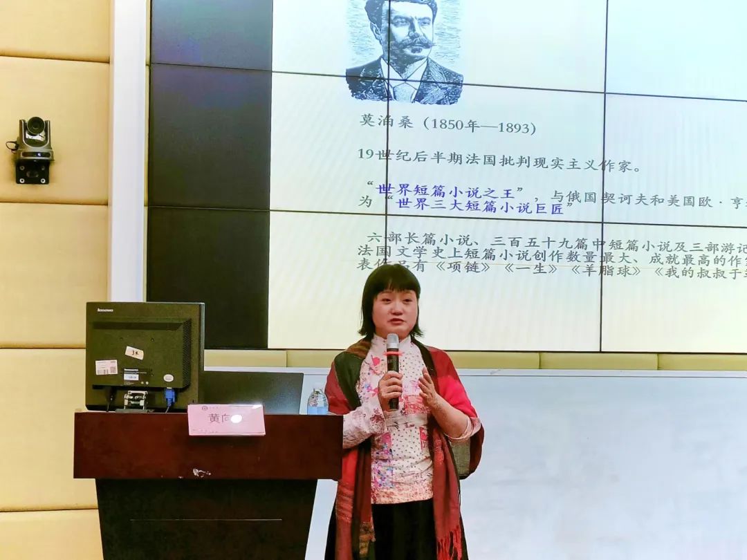 黄向辉教授通过播放短视频的方式引导同学们深入中世纪的西方社会,探索莫泊桑的文学世界。黄老师带领同学们共同欣赏莫泊桑的《春天》,通过对经典名篇的对比分析,感受莫泊桑的创作风格。黄老师指出,同学们善于学习莫泊桑的创作技巧,将“阅读”与“思考”紧密结合,用心去感受字里行间的情感。