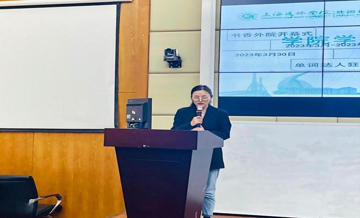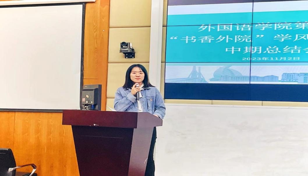 尹洁老师对外国语学院过去半年的成绩做了汇报。外国语学院分别从爱读、善思、勇讲三个主题方面举办了一系列学风建设活动,“单词达人狂读”、“经典美文诵读”、“优秀学子领读”、“教授推荐精读”和“大咖分享品读会”等一系列“爱读”活动帮助同学们熏陶文化,开拓视野;“社团读书分享沙龙”、“朋辈读书讲堂”、“读书心得”等活动号召同学们读有所思,思有所感;“讲好中国故事”“创作文学作品”、“唱响文化魅力”和“争做小老师”等“勇讲”活动,增强学生的语言和文化自信,提升同学们的精神境界。