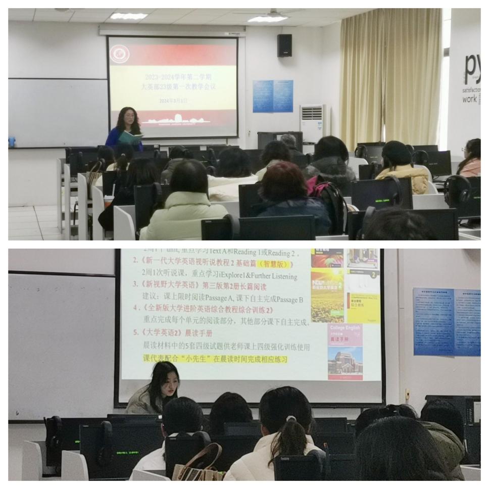 接着,孔主任向与会老师介绍了大英部的组织架构;随后,她从四方面对上个学期的工作进行了回顾和总结,包括期末考试情况,2023年12月CET-4考试情况,师、生比赛获奖以及寒假的工作;接下来,第五届“我心中的好老师”王颖老师、兼职奖教金二等奖获得者岑莉老师以及学生评教分数较高的李博老师就如何提高学生学习积极性和效果分享了经验和心得;最后,孔主任对新学期的工作进行了部署,要求围绕“2024年6月CET-4考试”这个中心,狠抓第一课堂、考核第二课堂、有序推进竞赛活动。