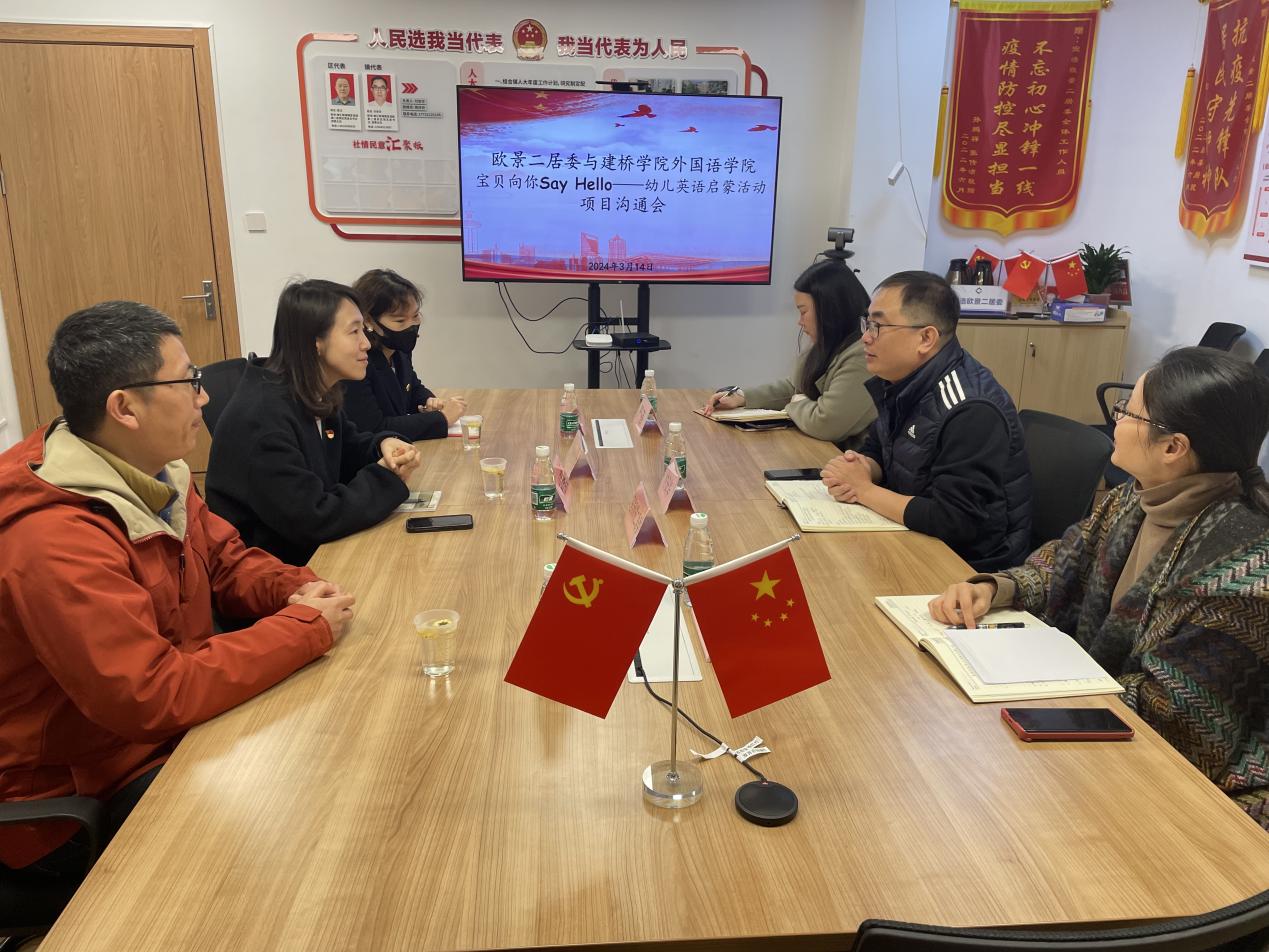 会议伊始,宜浩欧景二居委付安华书记对外国语学院领导和老师们的到来表示热烈的欢迎,并表示外国语学院在社区开展的两期幼儿英语启蒙活动都已圆满结束,学院志愿者队伍展现了当代大学生的风采,认真的工作态度也得到了居民的高度认可,为社区的小朋友们提供了一个学习交流的平台,也在寓教于乐的氛围中促进了儿童的健康成长。为不断增强社区居民的幸福感和满意度,居委工作者也汇集了居民的建议和意见,希望学院结合居民需求不断优化教课方案。