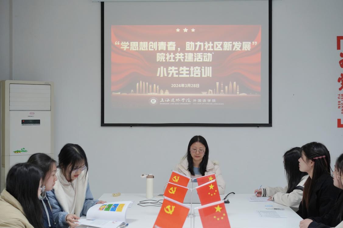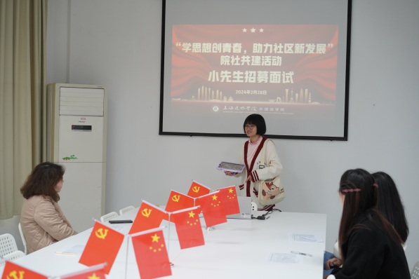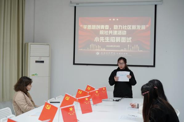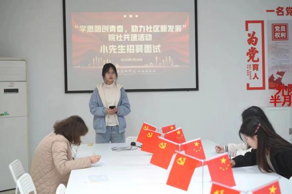 为深入学习贯彻习近平新时代中国特色社会主义思想,深入推进学校、社区协同育人,进一步深化“院社共建”的实践育人理念,外国语学院于2024年3月28日下午在外院303举办了以“学思想创青春,助力社区发展”为主题的“小先生”招募面试活动。出席本次活动的有:外国语学院党委组织员刘沛雨、英语系指导教师王嘉怡、第二期“院社共建活动”组长杨薏雯、陆语嫣。
