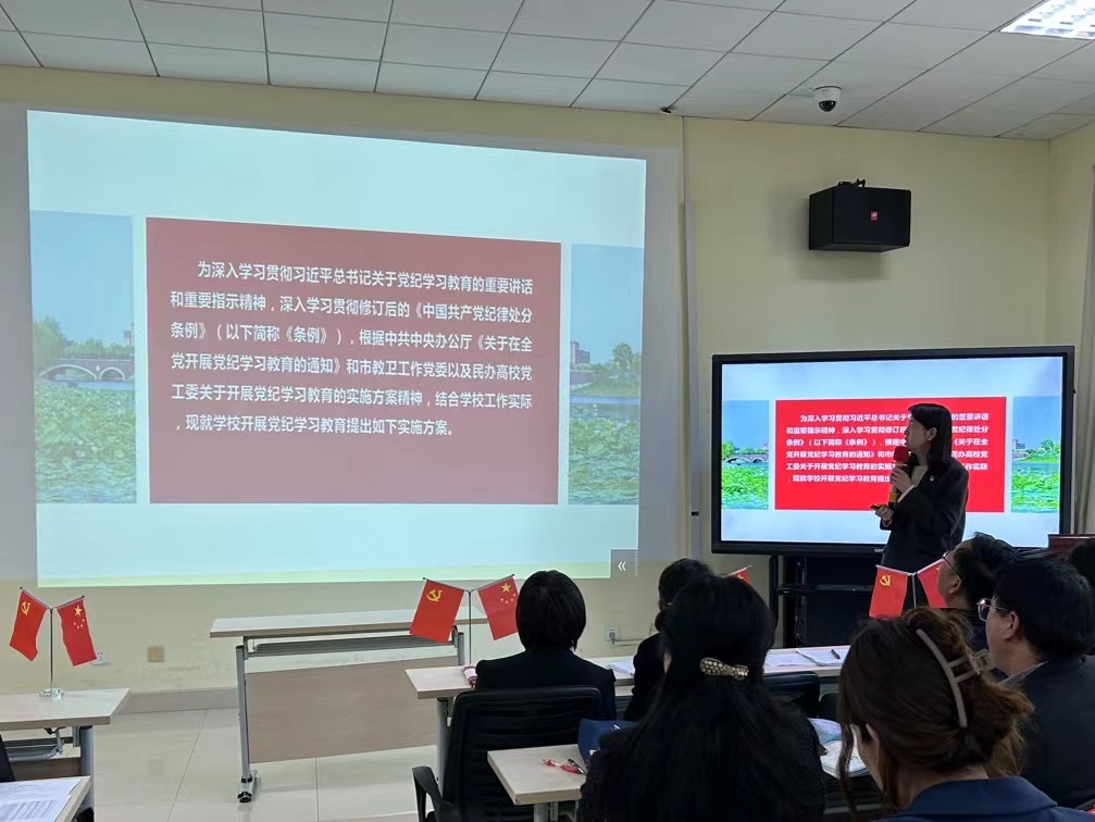 会上,杜鹃书记带领学习了习近平总书记关于党纪学习教育的重要讲话和重要指示批示精神、中央党的建设工作领导小组会议精神和中共中央办公厅《关于在全党开展党纪学习教育的通知》精神,传达了学校关于党纪学习教育的工作要求。